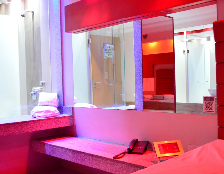 El equipamiento que acompaña a esta categoría se compone de bañera romana, cabina de ducha y toilette completo junto a la cama rodeada de paredes espejadas.